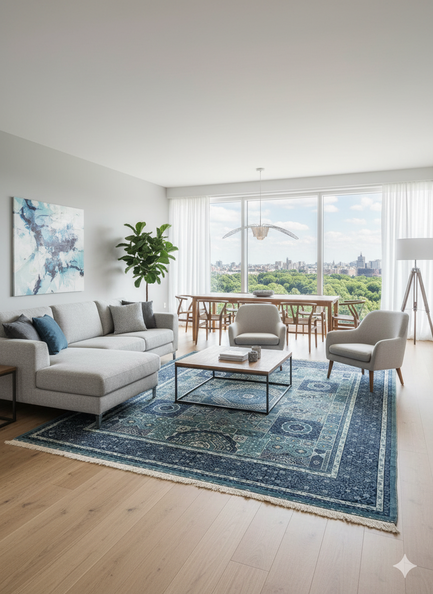 Enhance your space with the timeless beauty of this blue persian rug, a luxurious piece that embodies Persian artistry and craftsmanship. Measuring 8 x 10 (240cm x 300cm), this exquisite rug is hand-finished by skilled artisans, showcasing meticulous attention to detail in its intricate Horizon design. The rich blue tones create a serene and elegant look, making it perfect for adding a touch of heritage to your living room, bedroom, or office. Crafted with premium bamboo silk, this 8×10 persian rug blends timeless design with modern appeal, offering a stunning addition to your décor. Bring luxury home—order now from Afra Rugs!